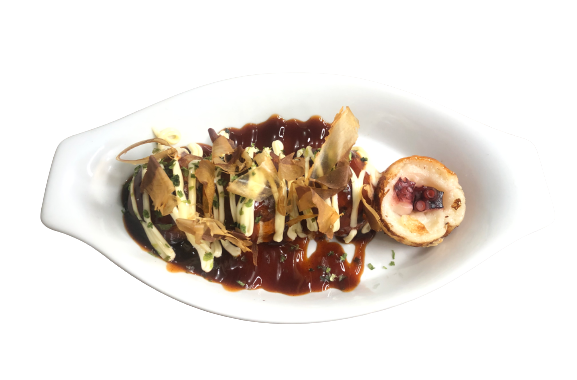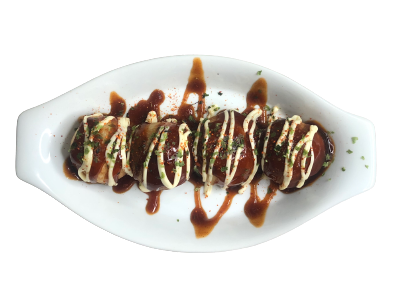 Comes with Cheese cube, Special Takoyaki Sauce, Cheese Sauce, Japanese Mayo, Top with Cheese Melt, and Aonori powder